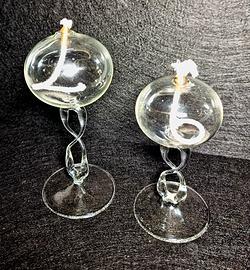 Due lampade a olio in vetro vintage - una alta (18 x 8 cm) e una leggermente più bassa (15 x 7 cm) - realizzate in vetro trasparente con stoppino metallico. Sono riempite con olio per lampade speciale o olio di paraffina purificato. Lo stoppino passa attraverso il manicotto metallico. Bruciano con una fiamma uniforme e calma, senza fuliggine (se si utilizza l'olio giusto). È possibile aggiungere olio per lampade aromatico.