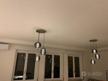 Lampade a sospensione montate 3 settimane fa in casa. Sono formate da 3 luci, internamente i paralumi sono in metallo traforato mentre quelli esterni sono in vetro fumè per creare un’atmosfera romantica con luce soffusa e fascio di luce centrale.