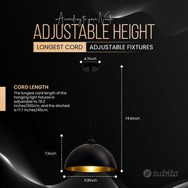 Con dimensioni di 117 x 30 x 30 cm, questa lampada a sospensione è di colore nera e oro . Compatibile con qualsiasi lampadina con attacco E26 (lampadina non inclusa), supporta fino a 60W per un’illuminazione intensa ed efficace.