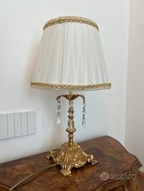Le lampade hanno una solida base in ottone lavorato, ricca di dettagli decorativi, con pendenti in cristallo molato che donano riflessi raffinati. I paralumi sono in tessuto plissettato color avorio, rifiniti con passamaneria dorata.
