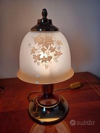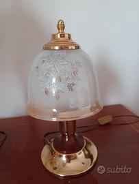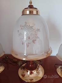 N° 3 abat-jour, due piccole da comodino e una grande. Porta lampada in legno con base in ottone e paralume in vetro opaco con decori floreali.