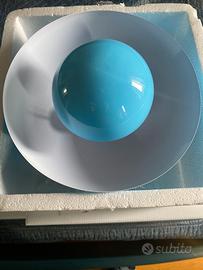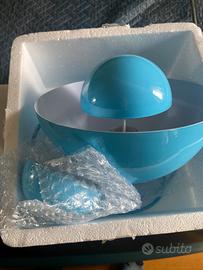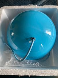 Lampadario dal design moderno con una sfera centrale che crea un punto focale esterno azzurro interno laccato bianco