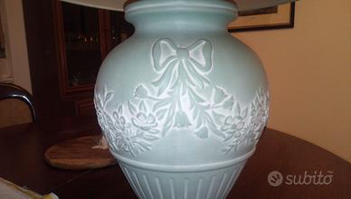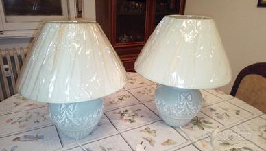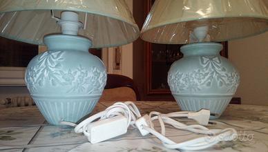 3 lampade da tavolo, 2 piccole per comodini e 1 grande per cassettiera settimino comò della camera da letto in fine ceramica color verde acqua con paralumi NUOVE