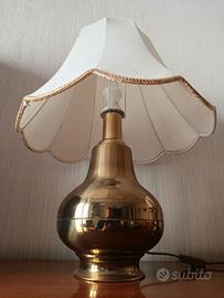 Coppia di lampade da comodino in ottone con abat-jour in tessuto avorio; diametro abat-jour cm 29 / diametro corpo di ottone cm 15 circa / altezza cm 43,5 / con lampadine bianco-latte LED con attacco E14 da 5W e 7W e cavo di alimentazione da circa 120 cm con spina P10 e interruttore volante. Peso 1,3 kg ciascuna. Lampada da tavolo o comò stesso stile; diametro abat-jour cm 43 / diametro corpo di ottone cm 20 circa / altezza cm 59, con portalampada E27, lampadina biancolatte a filamento da 60W e cavo di alimentazione da 105 cm con spina P10 e interruttore volante. Peso 1,3 kg circa. Prezzo per le 2 lampade da comodino 50 Euro. Prezzo per la lampada grande da tavolo 50 Euro. I 3 pezzi in blocco: 90 Euro.