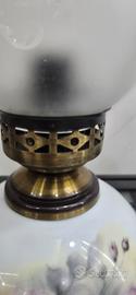 Elegante coppia di lampade da comodino in autentica porcellana di Limoges, finemente decorate a mano con delicati motivi floreali e arricchite da preziose applicazioni in oro zecchino 24 carati. Ogni lampada presenta una base sferica dalle linee classiche e un raffinato paralume in vetro satinato inciso a motivo vegetale, che richiama lo stile delle antiche lampade ad olio di fine Ottocento.