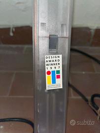 Struttura in policarbonato trasparente con bracci orientabili, cablaggi a vista e testa regolabile. Progetto tecnico e innovativo, premiato con Design Award Winner 1997 – Industrie Forum Design Hannover (adesivo originale presente).