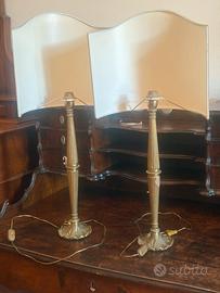 Coppia di antiche lampade da tavolo in ottone e paralume in tessuto Altezza 75 cm Larghezza 35 cm Duametro base 11,5 cm