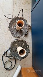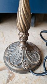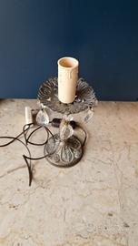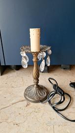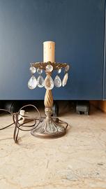 Coppia di lampade da tavolo stile candelabro vintage Ottone con decorazioni a rilievo e forma a spirale Pendenti in cristallo trasparenti a forma di goccia e ottagonali, appesi a un supporto superiore a raggiera Lampada elettrica con portalampada E14 centrale, dotata di cavo di alimentazione e interruttore, l'altra con cavo alimentazione e presa di corrente Altezza 21,5cm circa, base 9cm diametro Ideale come complemento d'arredo classico o per creare un'atmosfera elegante in ambienti vintage