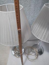 Queste lampade da tavolo uniscono un'eleganza classica a un tocco di modernità, rendendole adatte a diversi stili di arredamento, dal contemporaneo al glamour. Il design si distingue per la sua base scultorea, composta da un fusto sottile e affusolato in vetro trasparente che riflette la luce, creando giochi di iridescenza. Un elemento sferico in vetro, con una finitura craquelé o satinata color argento, interrompe la linearità dello stelo, fungendo da punto focale. La base a disco, in metallo cromato a specchio, completa il look, offrendo stabilità e riflettendo l'ambiente circostante. I paralumi, in tessuto plissettato bianco e semitrasparente, diffondono una luce morbida e calda, creando un'atmosfera accogliente.