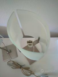 coppia di lampade da tavolo in acciaio spazzolato e paralume in vetro satinato.