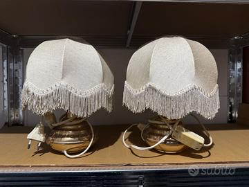 Due lampade in ottone con paralumi in tessuto con frange, adatte per comodini in camera da letto. Ciascuna euro 15.