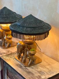 ❌ VENDUTE ** NON PIÙ DISPONIBILI ❌ Coppia di Lampade Artigianali con Elefanti e Paralume in Stile Asiatico Questa affascinante coppia di lampade unisce l’eleganza dell’artigianato tradizionale con un tocco esotico. Ogni lampada è scolpita a mano e rappresenta un gruppo di elefanti, simbolo di saggezza e prosperità, finemente lavorati con dettagli raffinati. Il paralume, realizzato in carta intrecciata e intagliata a mano, richiama lo stile vietnamita con la sua forma conica e la frangia decorativa, creando un’atmosfera calda e avvolgente. Perfette per ambienti dallo stile etnico, coloniale o boho chic, queste lampade sono ideali per dare carattere a un salotto, una camera da letto o un angolo lettura. •Materiale base: legno intagliato a mano •Paralume: carta intrecciata con dettagli in stile asiatico •Altezza: circa 30 cm •Origine ispirazione: Vietnam •Condizioni: ottime, funzionanti Un pezzo unico per veri amanti dell’arredamento d’autore. Prezzo per la coppia. Spedizione disponibile.