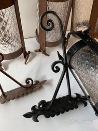 Magnifiche Lampade in Ferro Battuto a mano, complete di N°3 supporti a parete grandi e N° 2 supporti più piccoli. Le lampade sono completamente restaurate e verniciate con polveri termoindurenti a forno. Tre lampade sono di colore Marrone e una lampada è di colore nero. Per chi fosse interessato è stato pubblicato un annuncio di un lampadario a sei luci in ferro battuto e legno che è abbinato alle lampade. Il prezzo esposto si intende per tutti e nove i componenti (4 lampade + 3 supporti grandi + 2 supporti piccoli).