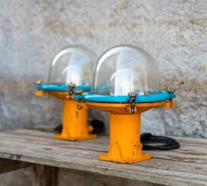 Coppia di lampade industriali anni 30/40 , corpo in metallo , cupola in vetro spesso , cavo elettrico nuovo , lampadine a led nuove , possono essere fissate a soffitto , provenendo da ambiente di lavoro industriale (usate su mezzi navali) sono pesanti e massicce.