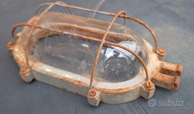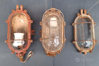 vendo le 2 lampade laterali che si vedono in foto, la centrale non è più disponibile. Sono originali d'epoca vintage che vedete in foto, non so dire di che anno siano ma sono antiche, molto vecchie. Ricordo che venivano usate in miniera o nei capannoni di officine.