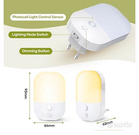 Questa luce notturna da presa offre 5 livelli di luminosità regolabili: 20%, 40%, 60%, 80% e 100%, per adattarsi alle tue diverse esigenze. In modalità AUTO, la sua funzione di rilevamento intelligente della luce rileva automaticamente la luce ambientale, si accende quando è buio e si spegne quando c'è luce