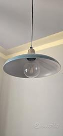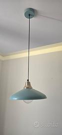 Set composto da due sospensioni portalampada in metallo smaltato, verde salvia esternamente e bianco nella parte interna. Coprifilo di aggancio al soffitto anch'esso smaltato e verniciato nello stesso colore verde salvia. Cavo di dicesa nero (finitura corda). Diametro portalampada 30cm. Lunghezza cavo discesa 87cm. Lampade non incluse (attacco standard E27). Per altre foto e/o informazioni scrivetemi pure.