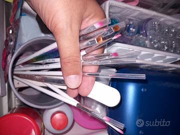 Accessori per nail art, come glitter, cartine per ricostruzioni, pennelli, spugnette e altro.