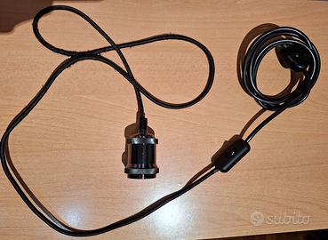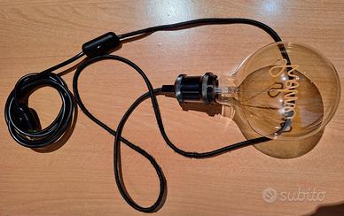 Lampadina decorativa E27 con filamento LED e scritta decorativa "Hello". Luce Calda 2000-3000K. Funzionante ed in ottimo stato, incluso anche un portalampada E27 in metallo e cavo elettrico tessile (quest'ultimo leggermente sfilacciato ed eventualmente da sostituire, vedi foto).