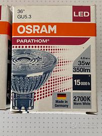 Vendo lampadine OSRAM, potenza di consumo 4,6 W equivalente 35 W, resa luminosa 350 lumen, colorazione luce 2700 K, classe energetica A+, fascio luminoso 36°, attacco GU 5.3 Vendo solo in coppia 5€