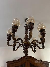 Lampadario con 8 punti luce + lampada da terra coordinata in legno e ottone