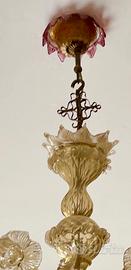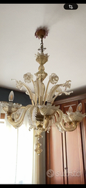 Classico lampadario veneziano anni 90 in vetro di Murano dorato , 6 luci, arricchito da foglie e fiori. Comprensivo di 2 elementi sostitutivi. Dimensioni: diametro 60 cm, altezza 110 cm. Ritiro presso il domicilio