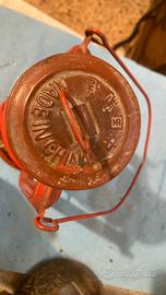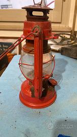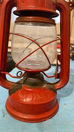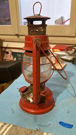 Vendo lanterna a petrolio vintage in metallo verniciato rosso, stile “hurricane lantern”, produzione cinese degli anni ’60-’70. Corpo in lamiera stampata rossa, globo in vetro trasparente protetto da gabbia in filo metallico, camino superiore con aperture di ventilazione, rotella di regolazione dello stoppino, gancetto laterale di sollevamento del globo per accesso allo stoppino. Sul serbatoio scritta in rilievo “ONLY PARAFFIN”. Sul fondo: “MADE IN CHINA” con caratteri cinesi. 📏 Altezza: 25 cm (27 cm con manico sollevato) Meccanismo di sollevamento globo funzionante. Condizioni: vintage, usata, con patina d’epoca. Vetro integro. Perfetta come oggetto decorativo o da collezione.