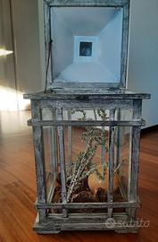 Lanterna in legno, vetro e coperchio in metallo.