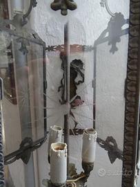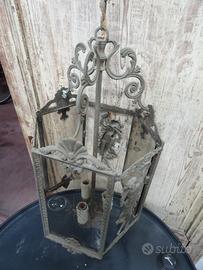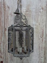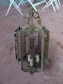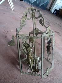 Bellissima e originale lanterna Liberty in bronzo a tre luci,firmata F.B.A.I nota azienda di Monza,con damina su tre lati e vetri incisi su gli altri lati.