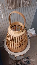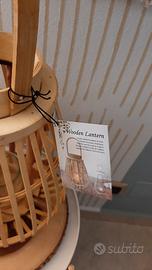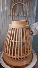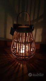 Lanterna in legno di pioppo con vasetto portacandela interno in vetro. Può essere sia da appoggio che da appendere. È l'ideale in un arredamento in rattan dallo stile bohemien.