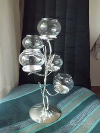 Elegante lanterna portacandele con struttura in metallo argentato e dettagli in vetro trasparente. 5 punti luce. Altezza 30 cm. - Nuova