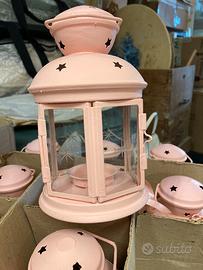 Vendo a stock 24 lanterne Ijea, metallo e vetro, altezza 21 cm, dipinte colore rosa.