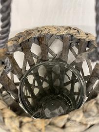 Struttura intrecciata in legno con porta candela in vetro interno e grazioso cuore decorativo frontale.
