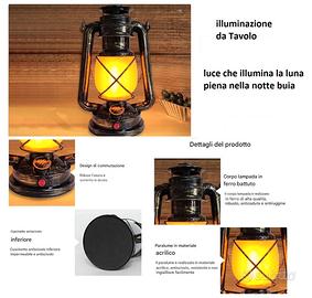 LANTERNA DA CAMPEGGIO: modalità di illuminazione: modalità fiamma, modalità respirazione, modalità luce costante materiale: ferro + acrilico emissione del colore: bianco caldo metodo di ricarica: tipo C capacità della batteria: 1200 m