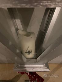 N°2 lanterne altezza circa 130 cm su piedistallo a 20 €/cad. Struttura in legno verniciata grigio metallizzato, vano con 4 vetri e porta candele interno.