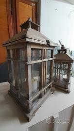 Vendo coppia di lanterne da giardino in legno di due diverse misure, tutte le lanterne decorative sono dotate del loro supporto da terra in metallo per appenderle in casa, negozio o giardino. La piccola ha un pezzo da incollare.
