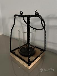 Coppia lanterne porta candele con base in legno, struttura in metallo e vetro