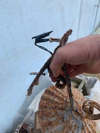 Vendo splendida lanterna da esterno in ferro battuto, autentico pezzo vintage dal forte fascino rustico e artigianale. La lanterna presenta: struttura in ferro lavorato a mano vetri decorati color ambra design classico ed elegante, perfetto per case di campagna, casali, agriturismi, porticati, taverne e ristrutturazioni in stile rustico o industrial La patina del tempo e l’ossidazione superficiale le conferiscono carattere e autenticità, ideale sia per chi ama lo stile vintage originale sia per chi desidera restaurarla e riportarla al suo splendore iniziale. Caratteristiche: Materiale: ferro battuto + vetro Stile: rustico / vintage / industrial Epoca: presumibilmente metà ‘900 Condizioni: da restaurare (come da foto) Perfetta come lampada da esterno, applique o lampione decorativo. Prezzo € 45,00 cadauna. Possibilità di ritiro a mano o spedizione accurata.