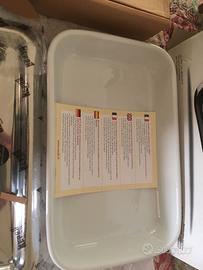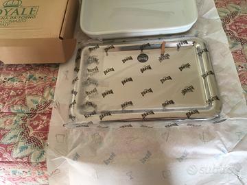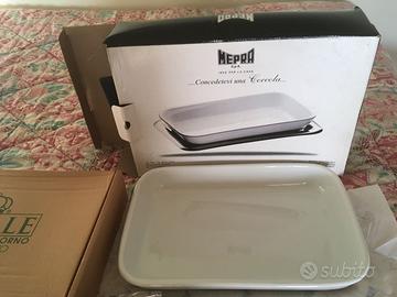 Lasagnera Mepra con il suo vassoio, porcellana da forno e acciaio lucido, nuova mai usata, nella sua confezione originale!