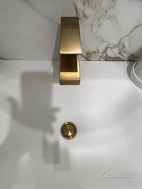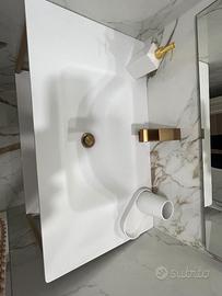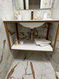 Mobile bagno sospeso 80 cm con lavabo e piano in solid surface e struttura metallica. Stile industrial e finitura color oro. linea KARAG NEW SOSPESO. Un mobiletto bagno di design moderno e minimale ideale per strutture ricettive, ristoranti o bagni che necessitano il massimo della semplicità. Il lavabo in solid surface colore bianco. Rubinetteria oro inclusa.