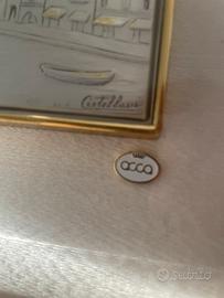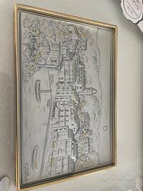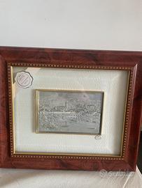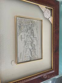 Lastra in argento Castellani, paesaggio, cornice in radica, dimensioni 33x28cm.