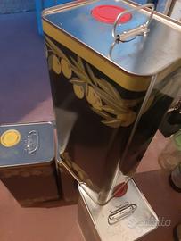 Vendonsi in blocco 4 lattine rettangolari da 5 litri per olio d’oliva EVO, realizzate in metallo per uso alimentare in banda stagnata elettrolitica (per preservare le qualità organolettiche dell’olio e proteggerlo dai raggi solari e dall’ossigeno). Bocchelli versaliquidi compresi (vedi foto). Sono state usate solo una volta, per trasportare l’olio, prima di versarlo in contenitori più grandi. Non adatte per contenere prodotti diversi dall’olio alimentare. Contattatemi per appuntamento e per visionare le lattine.