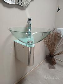 Lavabo a ciotola da appoggio. Ciotola tonda con diametro di 43 cm, in vetro verde trasparente comprensiva di piletta click-clack in finitura cromo.