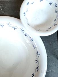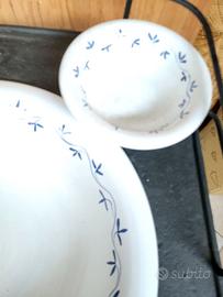 Lavabo antico in ferro battuto compreso di brocca, piatto grande e piattino in ceramica bianca e decori blu.