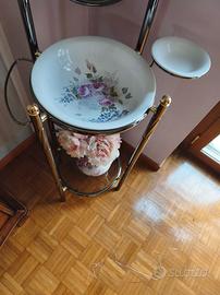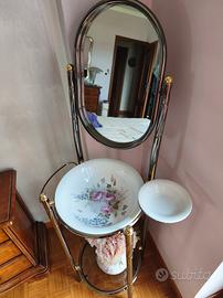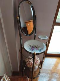 Struttura in metallo lucido che sostiene un bacile in ceramica e uno specchio orientabile.