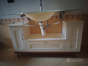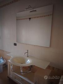 Pacchetto inclusivo di Lavabo in vetro di murano(originale) resistente agli urti, lunghezza circa 180 cm con annesso mobiletto e specchio a ciò aggiungesi vasca idromassaggio iacuzzi marca telma di lunghezza 170 cm larghezza 70 cm. Possibilità di scelta dei singoli pezzi.
