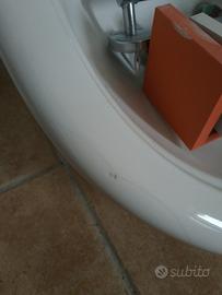 Vendo lavandino lavabo da bagno in ceramica, marca Azzurra, completo di colonna, miscelatore, tubi attacco acqua, scarico, supporti parete, porta asciugamani, mensoline, ecc. usato presenta una lieve scheggiatura come si vede in foto.