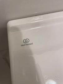 Lavabo bagno marca Ideal Standard bianco lucido con foro di troppopieno, completo di colonna colore bianco lucido, miscelatore e piletta di scarico a tirante cromati marca Treemme. I prodotti sono tutti in ottime condizioni.