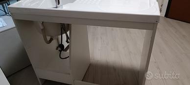 Lavabo bianco con mobiletto coprilavatrice , completo di asse in legno. In ottime condizioni. Misure: larghezza cm107, profondità cm 50, altezza cm 91. Non è compreso il rubinetto.