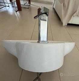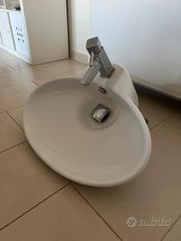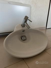 Lavabo in ceramica da appoggio per bagno, come da foto, corredato di rubinetto Teorema anche per bidet e vasca da bagno/doccia (un rubinetto necessita della sostituzione della cartuccia).